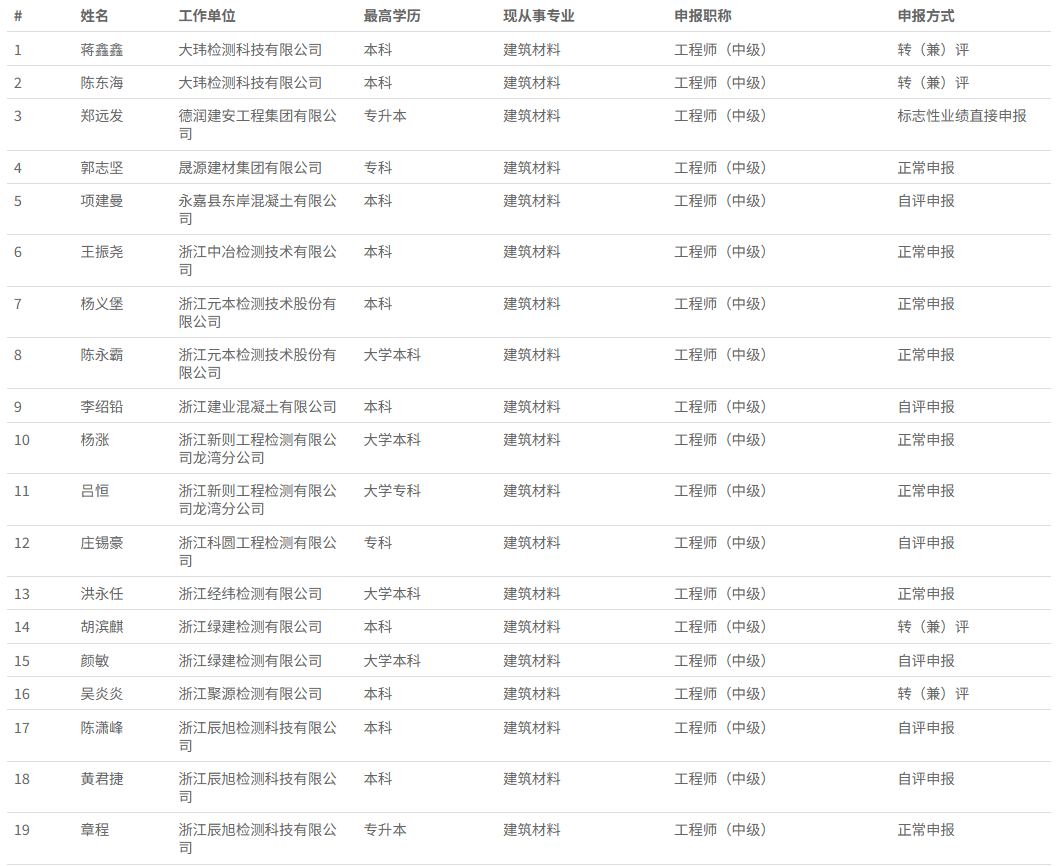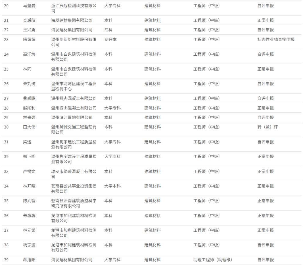 经温州市企业人员建筑材料专业工程师职务任职资格评审委员会于2025年10月23日审查投票通过,杨宗波等38人具有建筑材料专业中级技术职务任职资格;蒋旭阳等2人具有建筑材料专业初级技术职务任职资格,现予以公示,接受社会监督。现将有关事项通告如下:
