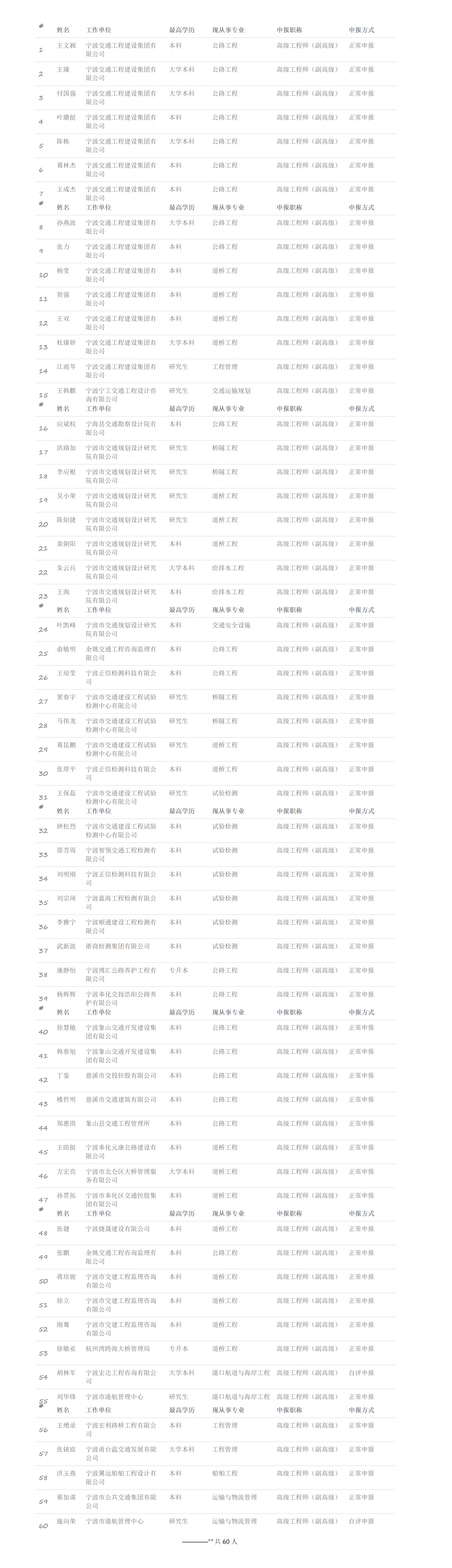宁波市交通运输工程高级工程师专业技术职务评后公示