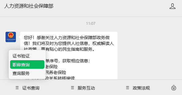 4. “人力资源和社会保障部” 微信公众号(菜单栏:证书查询 → 职称查询)
