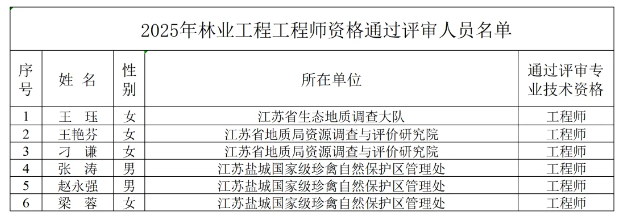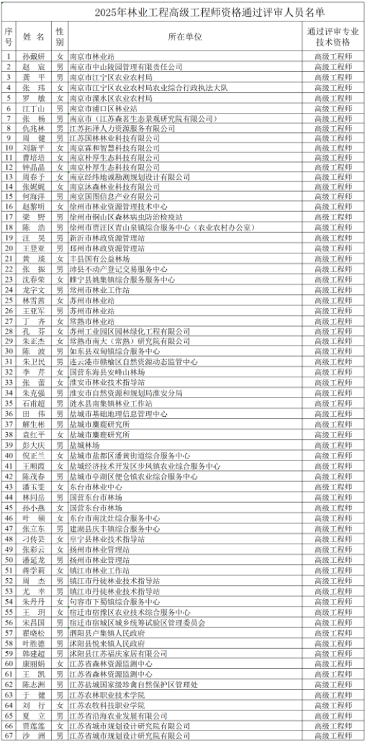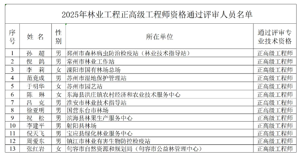 经江苏省林业工程高级专业技术资格评审委员会评审,全省共有86名专业技术人员通过评审,其中正高级工程师13名,高级工程师67名,工程师6名,现予以公示,接受监督。 公示时间:自公示之日起5个工作日(截止时间2025年10月31日,信件以邮戳为准)。任何单位或个人如对公示对象有异议,均可在公示期间向江苏省林业局专业技术人员职称工作领导小组办公室反映(电话:025-86275328、86275466;地址:南京市定淮门大街22号江苏林业大厦;邮编:210036)。 举报材料要求详细准确,单位举报应加盖单位公章,个人举报应署真实姓名,举报材料请附联系方式,以便进一步核实及反馈情况,逾期不予受理。