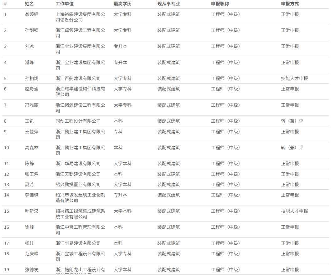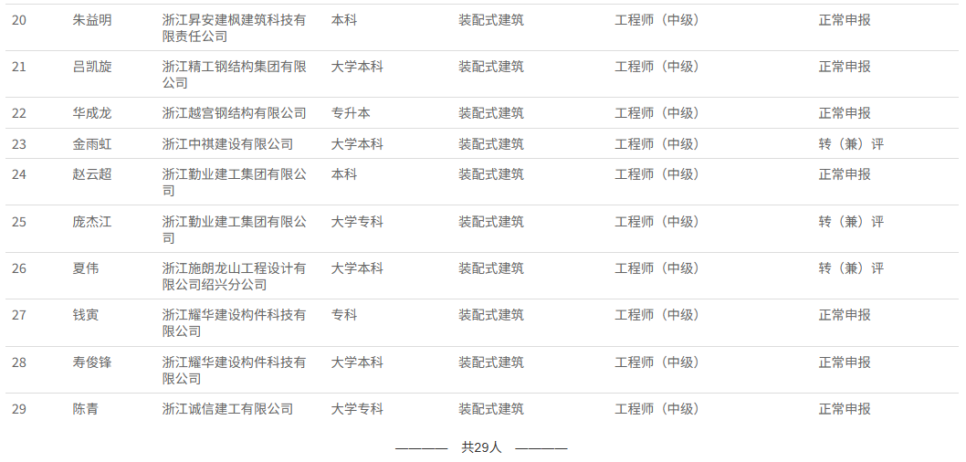 经绍兴市装配式建筑行业工程技术人员中级专业技术职务任职资格评审委员会2025年11月2日评审通过,翁婷婷等29 人具有工程师职务任职资格,现予以公示,接受社会监督。现将有关事项通告如下: