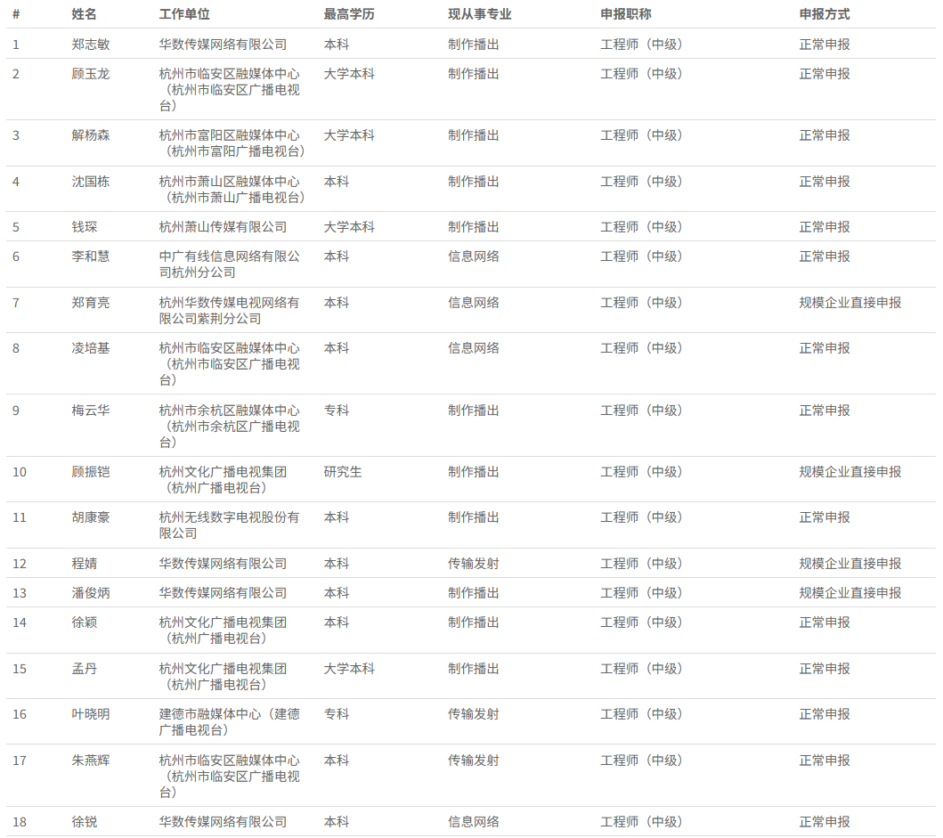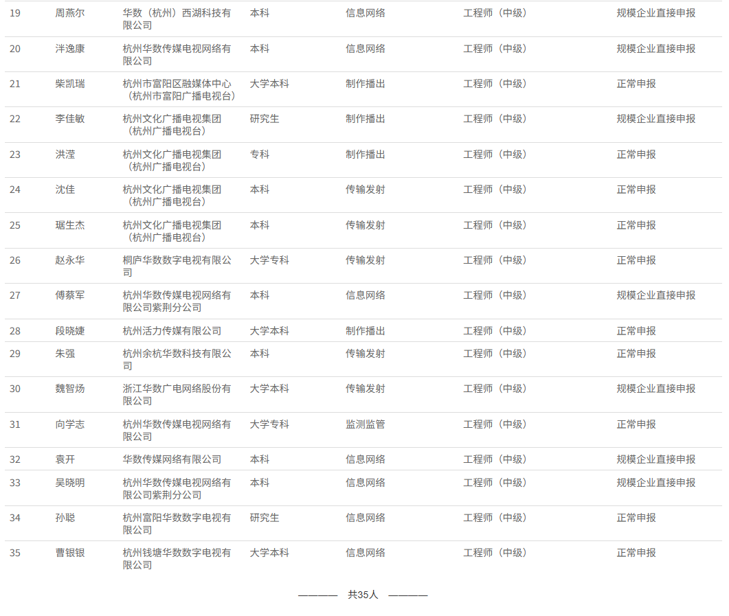 经杭州市广电工程技术人员工程师资格评审委员会2025年11月5日评审通过,郑志敏等35人具有中级工程师职务任职资格,现予以公示,接受社会监督。现将有关事项通告如下: