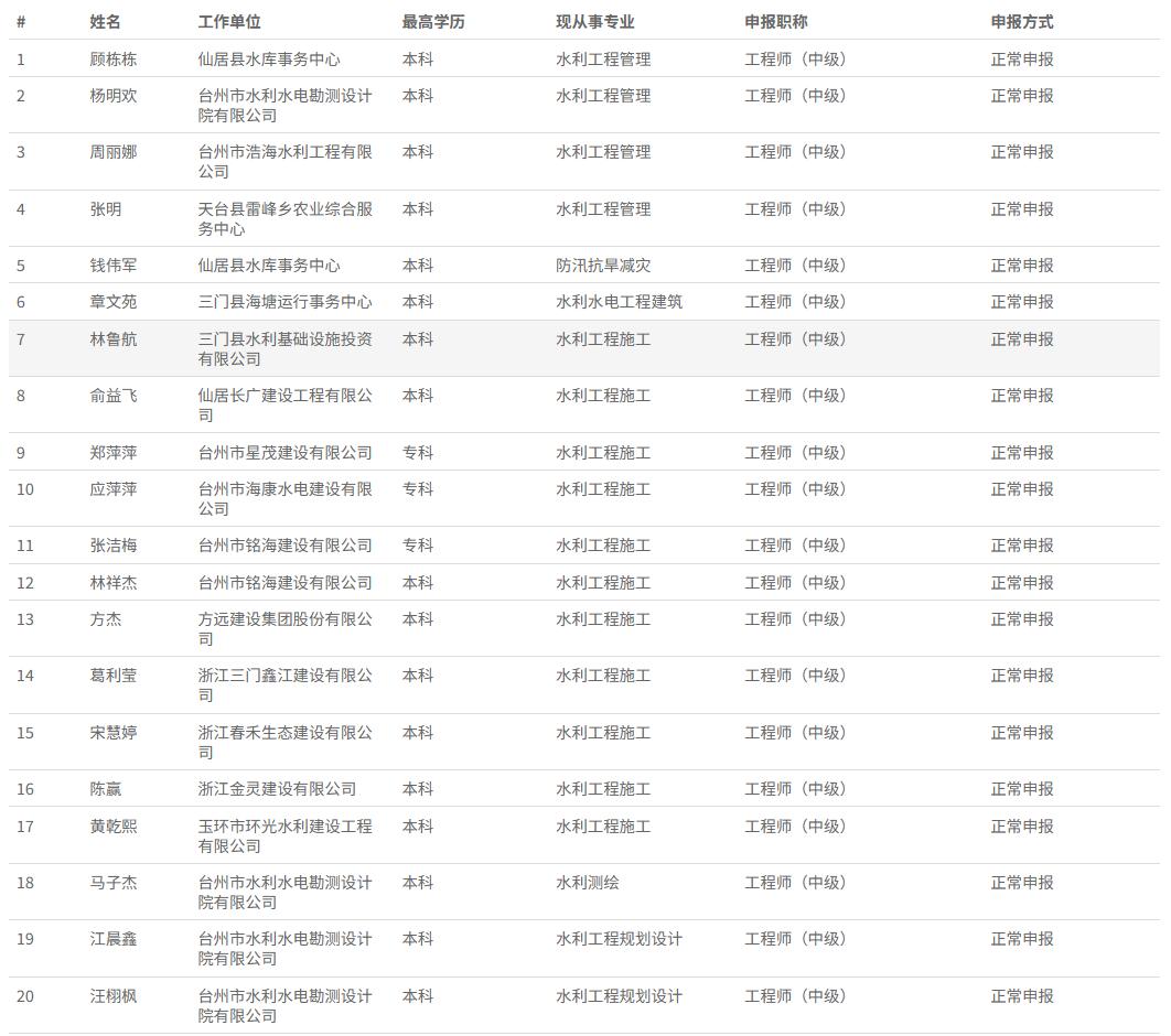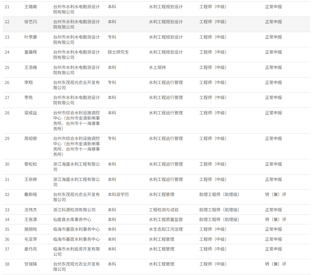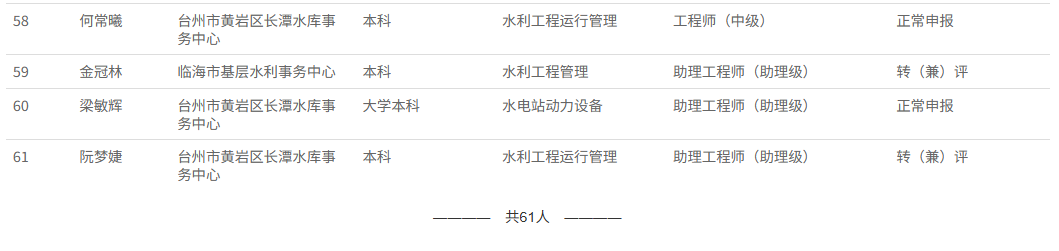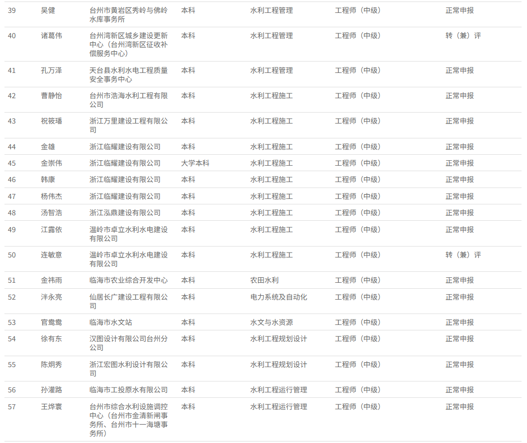 经台州市水利工程专业中级技术资格评审委员会2025年11月10日评审通过,顾栋栋等55人具有工程师职务任职资格,戴新晓等6人具有助理工程师职务任职资格,现予以公示,接受社会监督。现将有关事项通告如下: