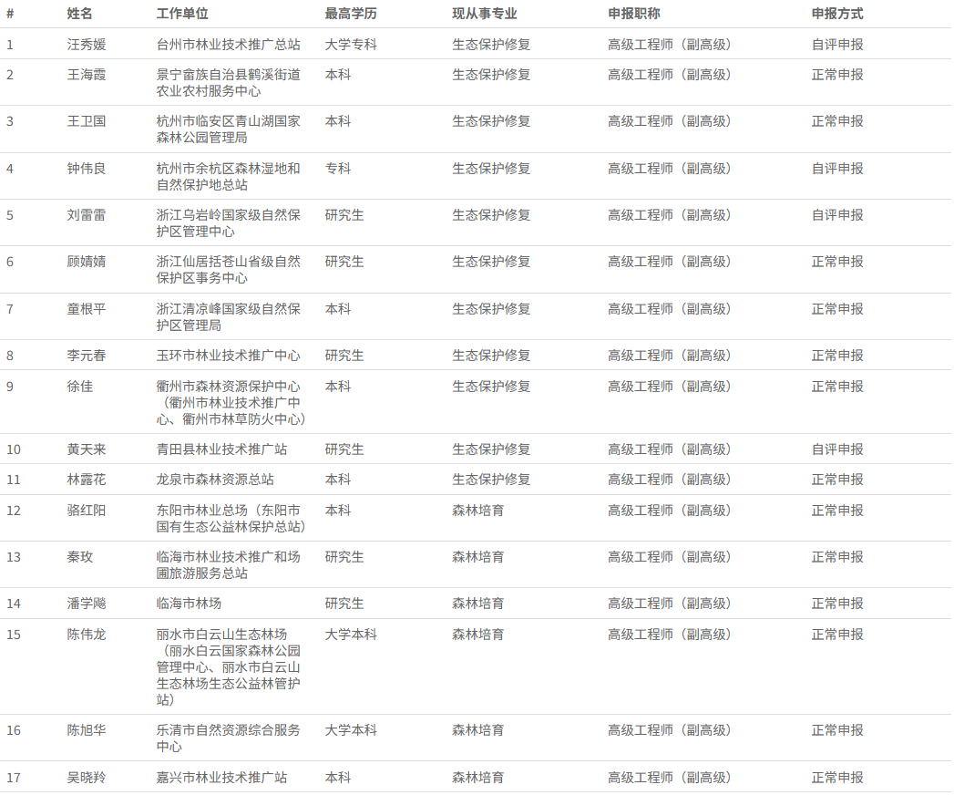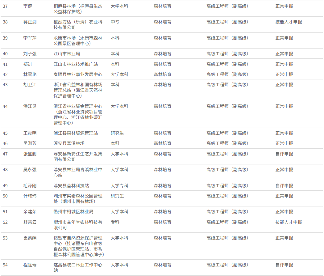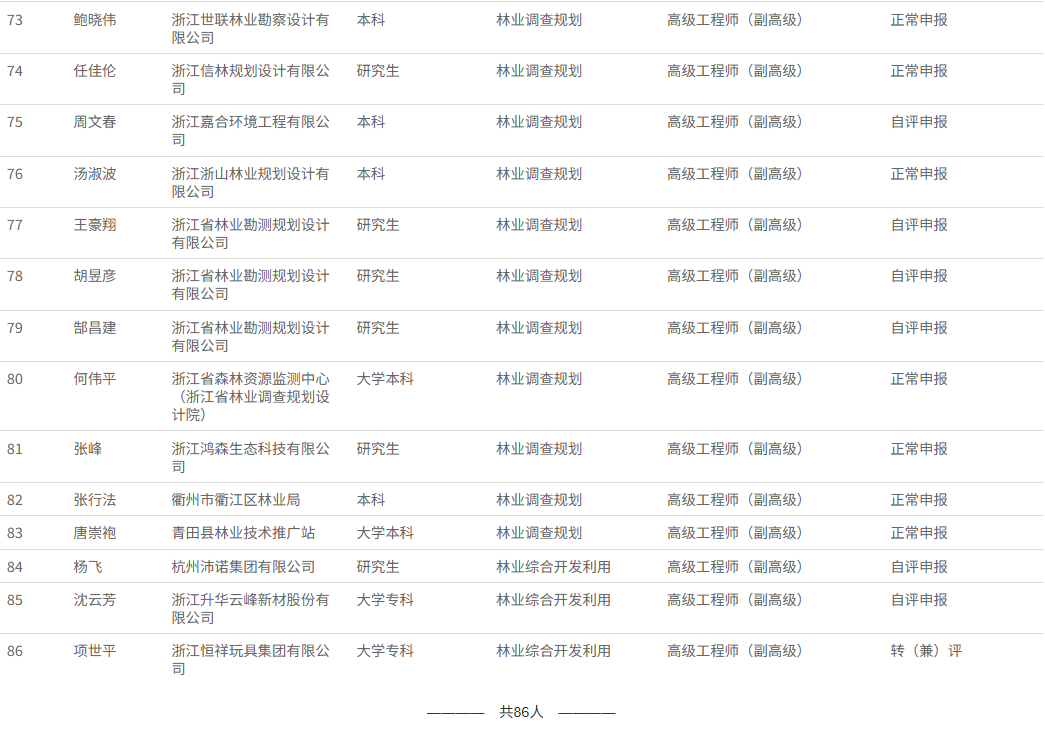 经浙江省林业工程技术人员高级工程师职务任职资格评审委员会2025年12月1日评审通过,汪秀媛等86 人具有高级工程师职务任职资格,现予以公示,接受社会监督。现将有关事项通告如下: