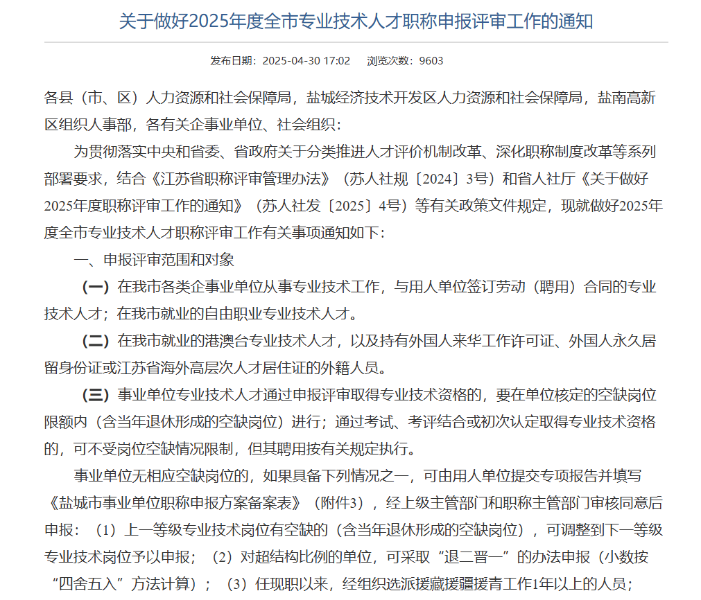 盐城市进一步明确,该市各类企业、非公经济组织的急需紧缺人才和优秀青年人才,如果能力业绩突出、为当地高质量发展作出较大贡献,可直接申报中级职称评审。