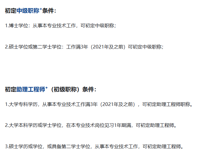 具体条件包括:博士学位获得者从事本专业技术工作可初定中级职称;硕士学位或第二学士学位获得者工作满3年可初定中级职称;大学专科学历从事本专业技术工作满3年可初定助理工程师。