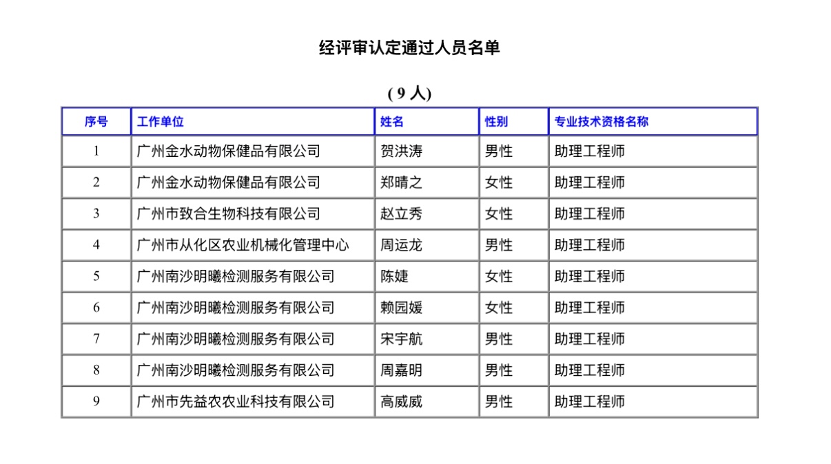 经广州市工程系列农业工程专业高级职称评审委员会评审认定通过,下列同志拟取得初级专业技术资格,现予公示。若对下列同志取得资格有异议,请电话或书面向初级专业技术资格评审委员会办公室或人事职改部门反映,反映情况的电话和书面材料要自报或签署(手写)真实姓名,不报或不签署真实姓名的,一律不予受理。