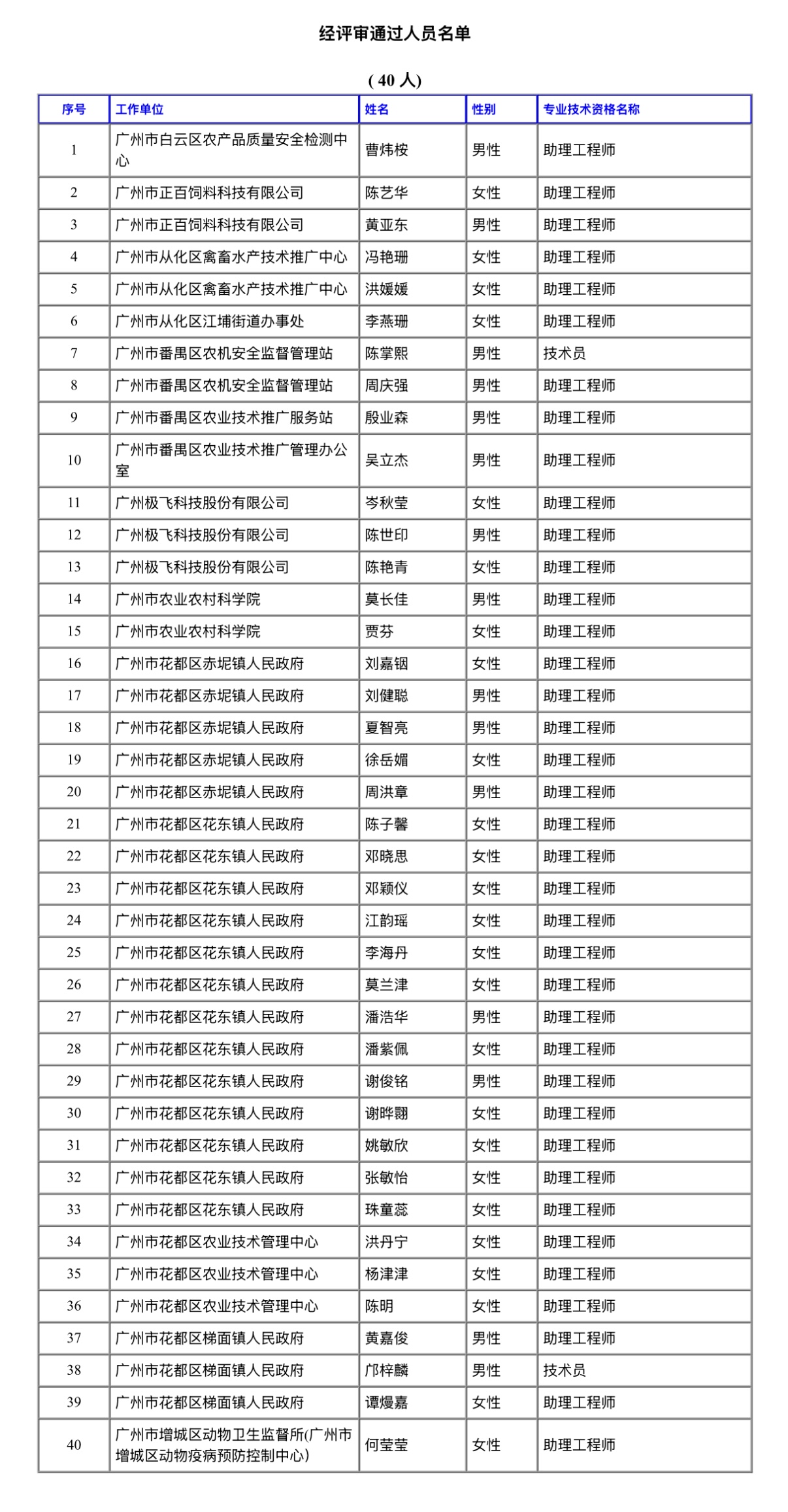 经广州市工程系列农业工程专业高级职称评审委员会评审通过,下列同志拟取得初级专业技术资格,现予公示。若对下列同志取得资格有异议,请电话或书面向初级专业技术资格评审委员会办公室或人事职改部门反映,反映情况的电话和书面材料要自报或签署(手写)真实姓名,不报或不签署真实姓名的,一律不予受理。