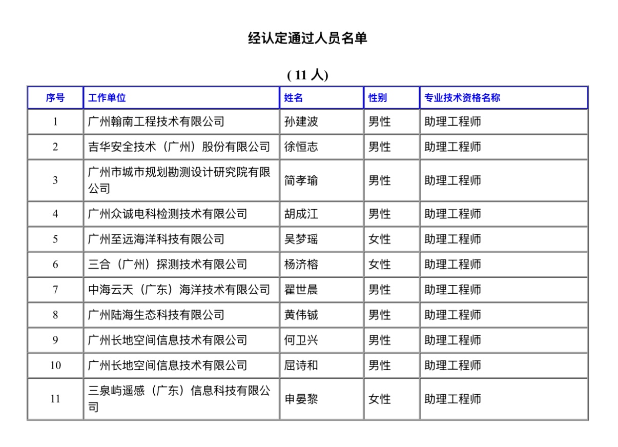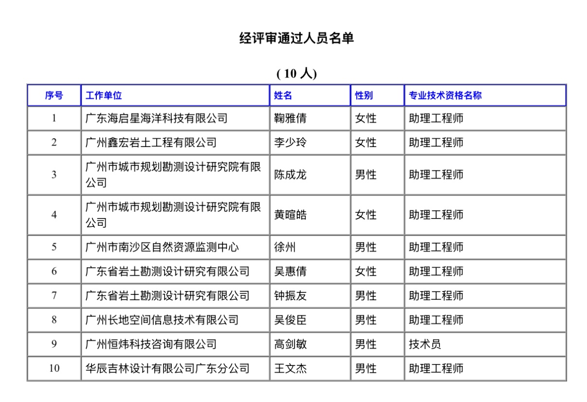 经广州市工程系列地质勘查工程和自然资源工程海洋专业技术人才职称评审委员会评审通过,下列同志拟取得初级专业技术资格,现予公示。若对下列同志取得资格有异议,请电话或书面向高级专业技术资格评审委员会办公室或人事职改部门反映,反映情况的电话和书面材料要自报或签署(手写)真实姓名,不报或不签署真实姓名的,一律不予受理。公示人员所在单位需同步在单位显著位置张榜或单位网站首页进行评后公示,时间不少于5个工作日。
