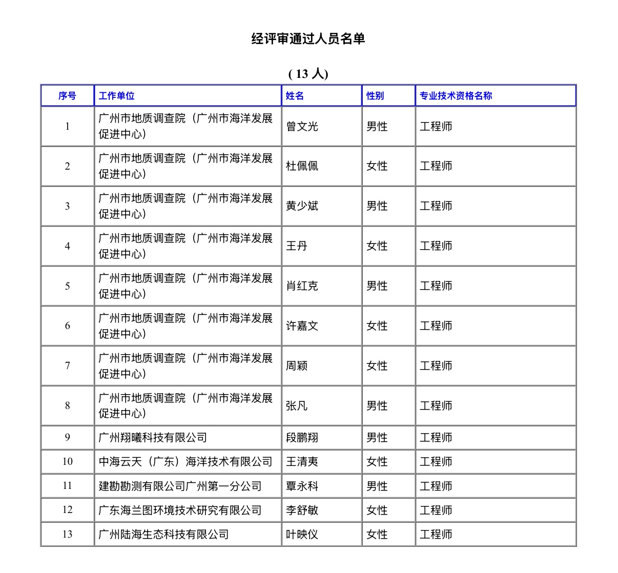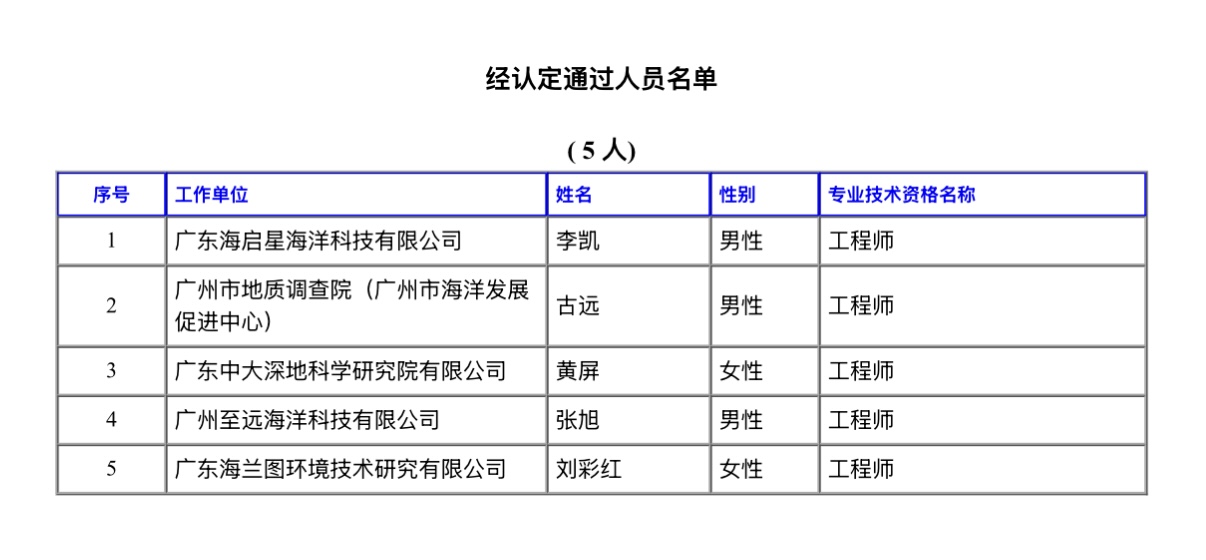 经广州市工程系列地质勘查工程和自然资源工程海洋专业技术人才职称评审委员会评审通过,下列同志拟取得中级专业技术资格,现予公示。若对下列同志取得资格有异议,请电话或书面向高级专业技术资格评审委员会办公室或人事职改部门反映,反映情况的电话和书面材料要自报或签署(手写)真实姓名,不报或不签署真实姓名的,一律不予受理。公示人员所在单位需同步在单位显著位置张榜或单位网站首页进行评后公示,时间不少于5个工作日。
