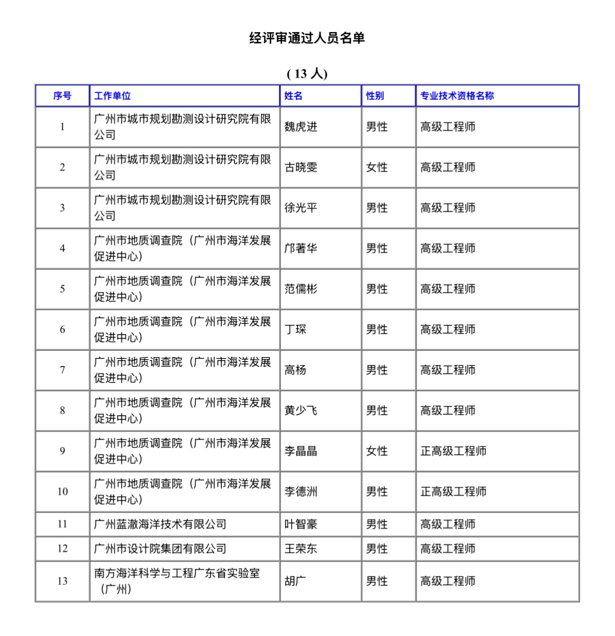 经广州市工程系列地质勘查工程和自然资源工程海洋专业技术人才职称评审委员会评审通过,下列同志拟取得高级专业技术资格,现予公示。若对下列同志取得资格有异议,请电话或书面向高级专业技术资格评审委员会办公室或人事职改部门反映,反映情况的电话和书面材料要自报或签署(手写)真实姓名,不报或不签署真实姓名的,一律不予受理。公示人员所在单位需同步在单位显著位置张榜或单位网站首页进行评后公示,时间不少于5个工作日。