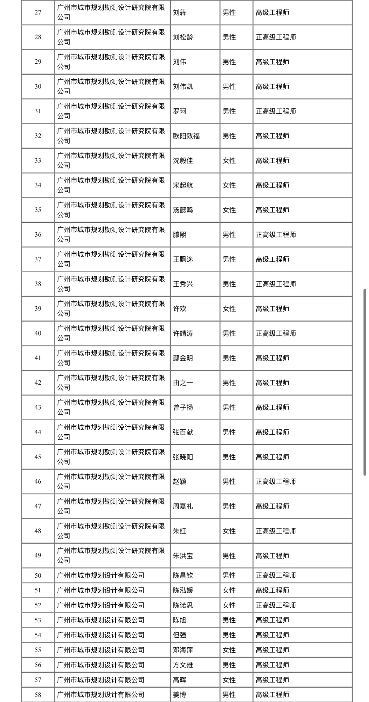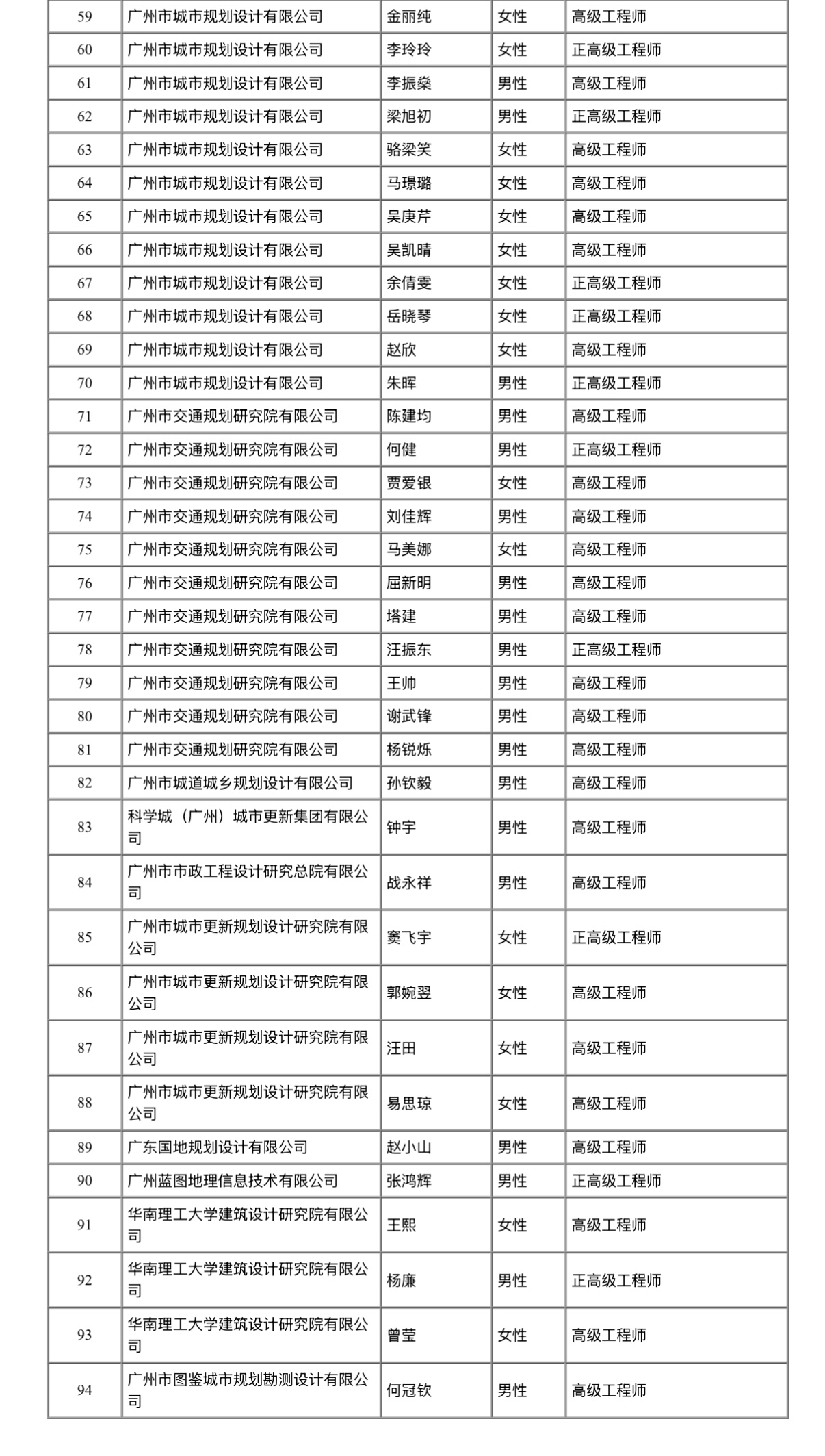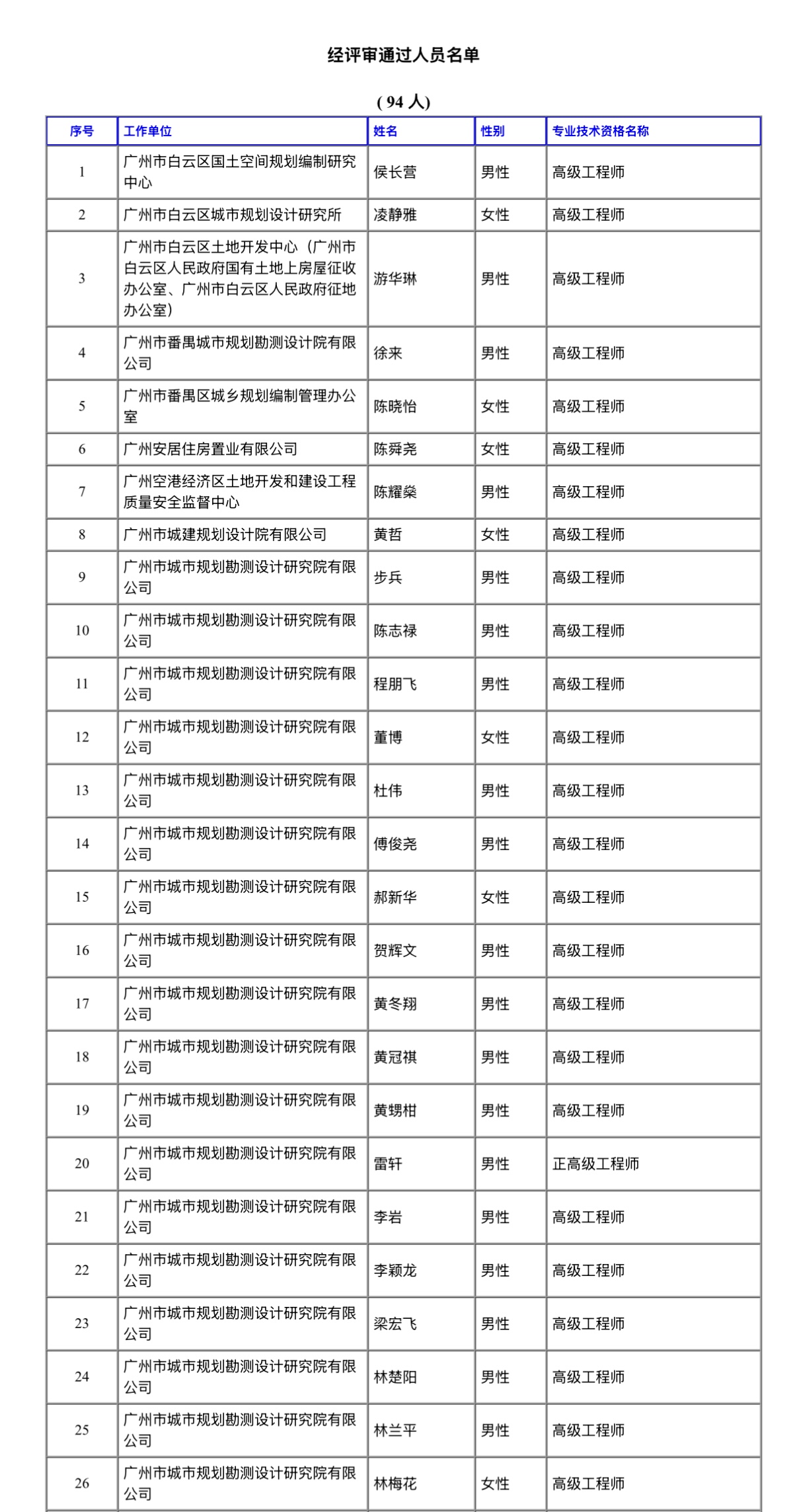 经广州市工程系列国土空间规划专业技术人才高级职称评审委员会评审通过,下列同志拟取得高级专业技术资格,现予公示。若对下列同志取得资格有异议,请电话或书面向广州市工程系列国土空间规划专业技术人才职称评审委员会办公室或人事职改部门反映,反映情况的电话和书面材料要自报或签署(手写)真实姓名,不报或不签署真实姓名的,一律不予受理。