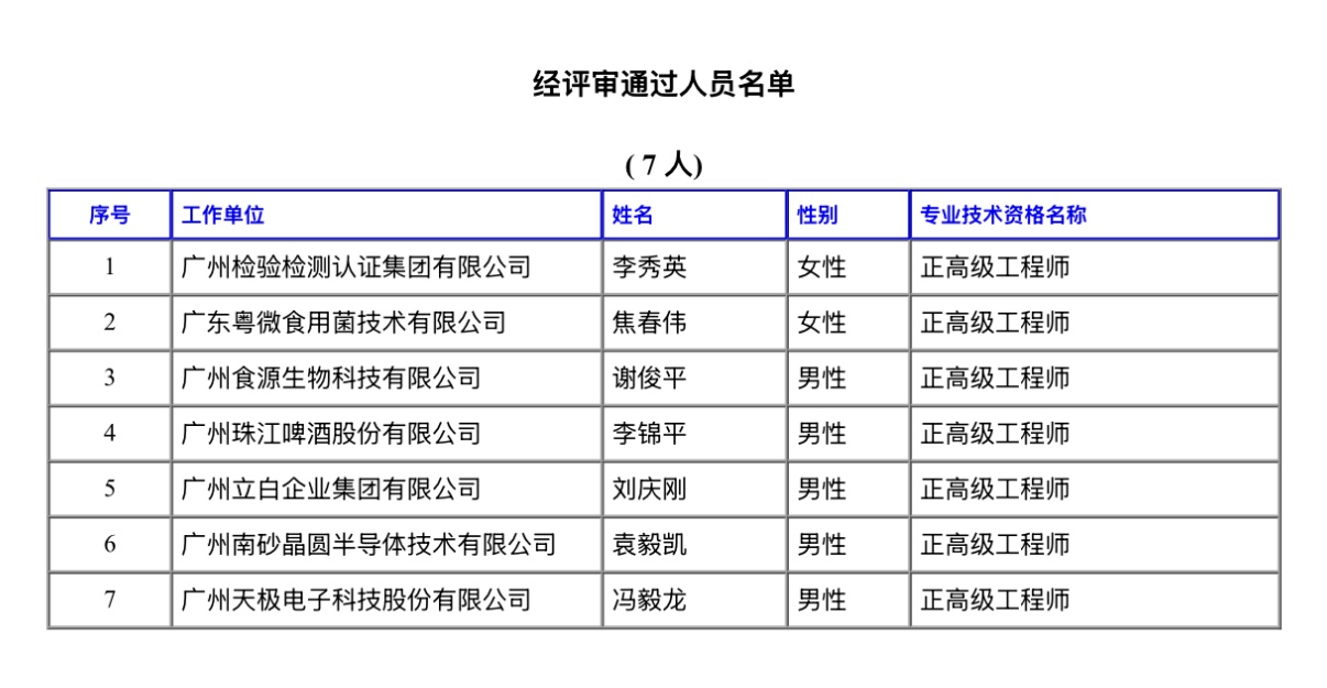 经广州市轻工工程、纺织工程、食品工程技术人才正高级职称评审委员会评审通过,下列同志拟取得正高级专业技术资格,现予公示。若对下列同志取得资格有异议,请电话或书面向高级专业技术资格评审委员会办公室或人事职改部门反映,反映情况的电话和书面材料要自报或签署(手写)真实姓名,不报或不签署真实姓名的,一律不予受理。